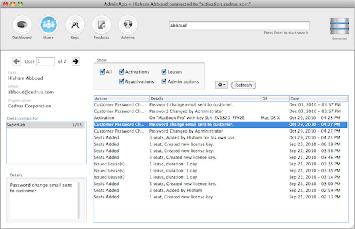 From now on, if a problem arises due to licensing, we can actually help you. We will help you. We have written all of the code on the SuperLab side, as well as the backend server, which has been up and running reliably for over a year now. We built a website for users who don’t have Internet access on the computer that they want to activate. We even developed Admin App, a program for in-house use that would give me and my team the best possible tool to assist you should a problem arise: