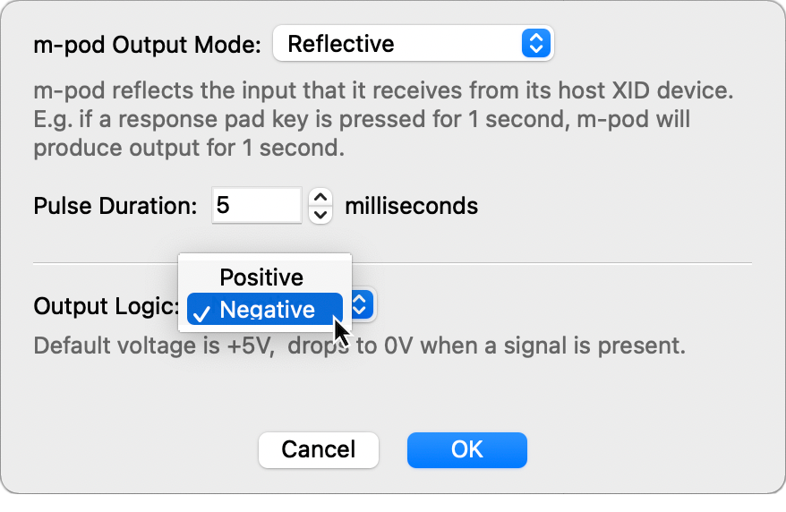 After we became aware of this difference, we updated the firmware for StimTracker Duo and Quad, m-pod, and c-pod. Version 2.2.7 provides support for negative logic; see Changing m-pod’s Output Mode and Logic: