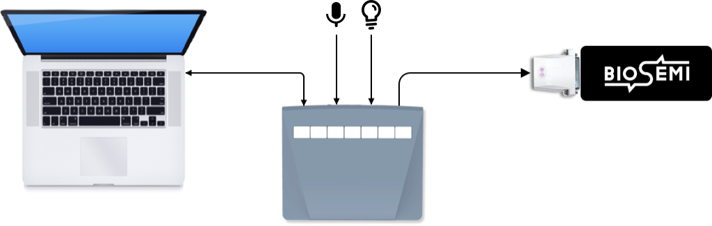 The response pad draws its power from your computer via USB. When a key is pressed, information is sent at the same time via USB to the computer and via m-pod to BioSemi.