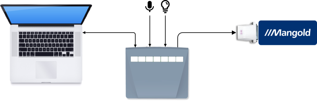 The response pad draws its power from your computer via USB. When a key is pressed, information is sent at the same time via USB to the computer and via m-pod to Mangold.