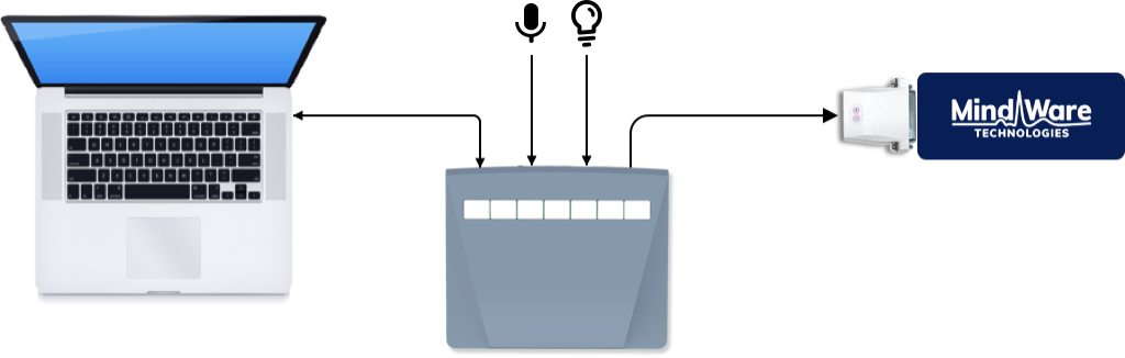 The response pad draws its power from your computer via USB. When a key is pressed, information is sent at the same time via USB to the computer and via m-pod to MindWare.