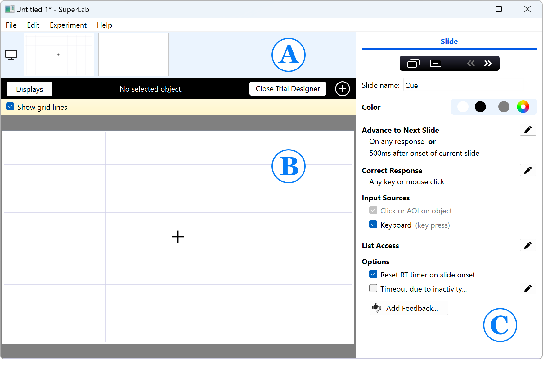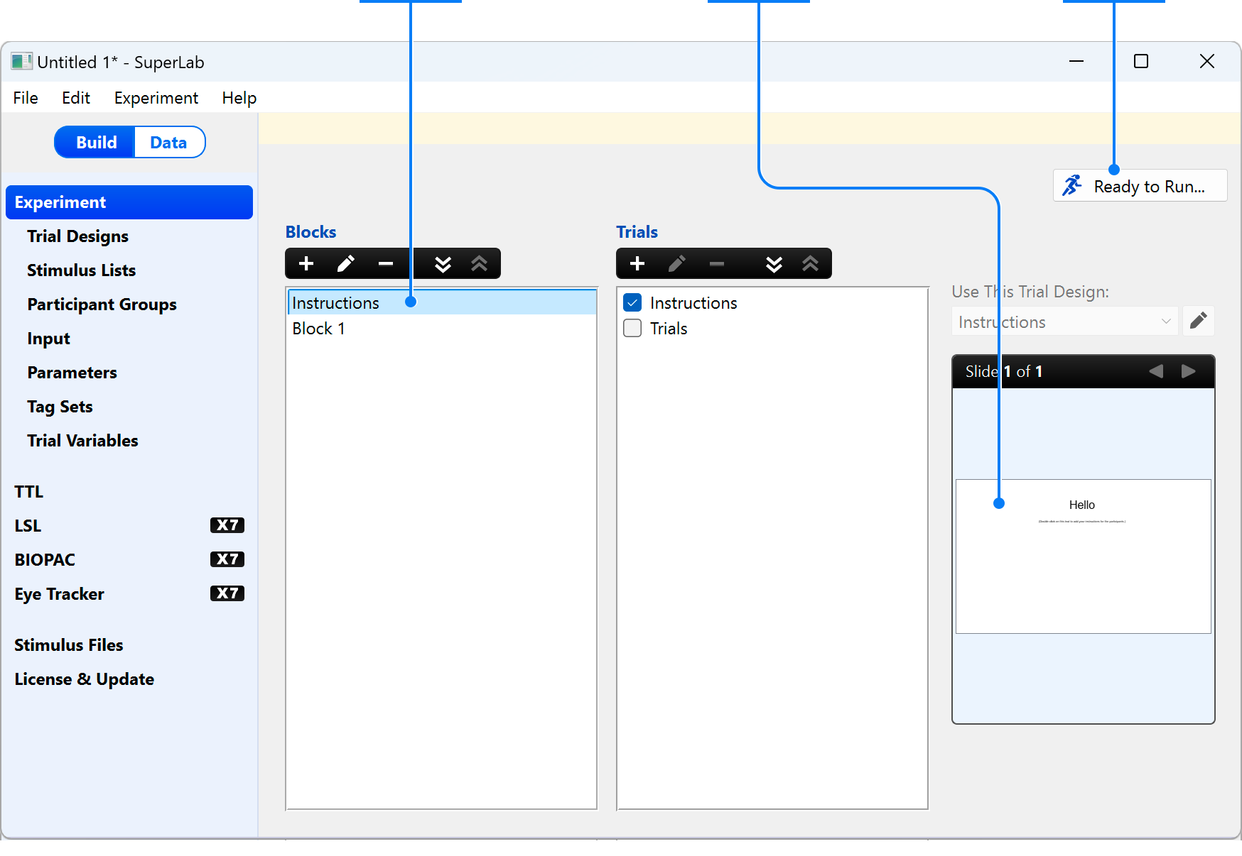 The basic units of a SuperLab experiment are blocks, trials, and trial designs. A trial requires one design. A block can consist of as many trials as you need: