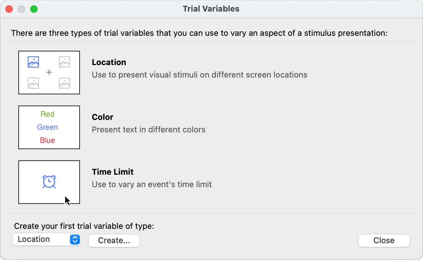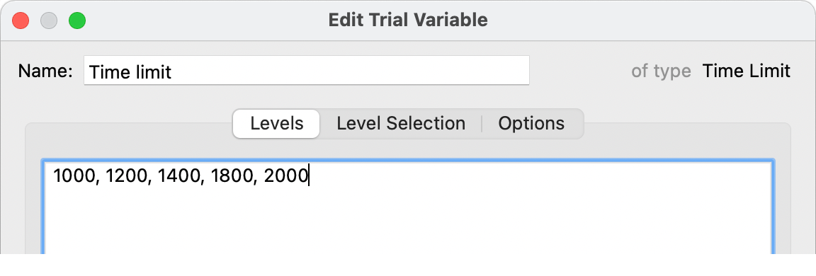 In this example, we want a time limit that varies between 1000 and 2000 milliseconds. Click on the Time Limit icon to create a trial variable: