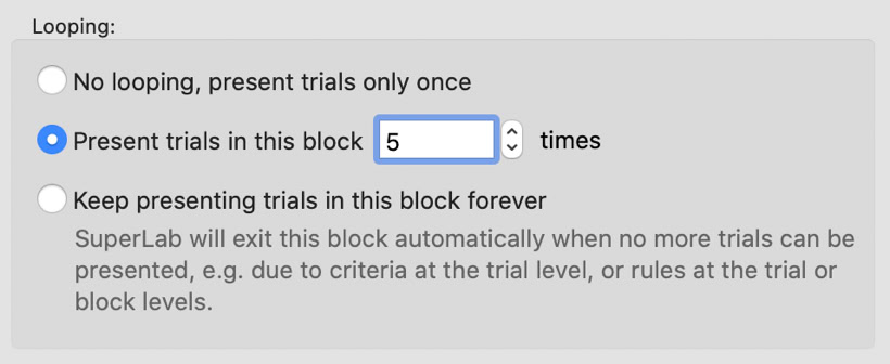 A built-in “loop guard” feature prevents the dreaded infinite loop: when a repeated block results in no trials being presented, SuperLab moves to the next block automatically.
