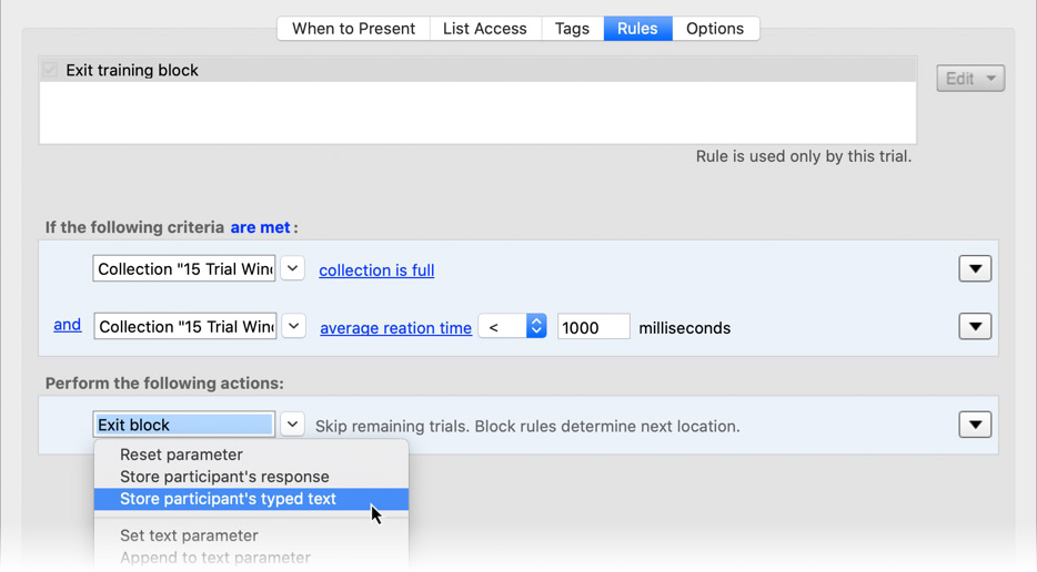 Attach tags to trials and change them at run-time to create contingent presentations. Tags are saved to data file to make analysis easier.