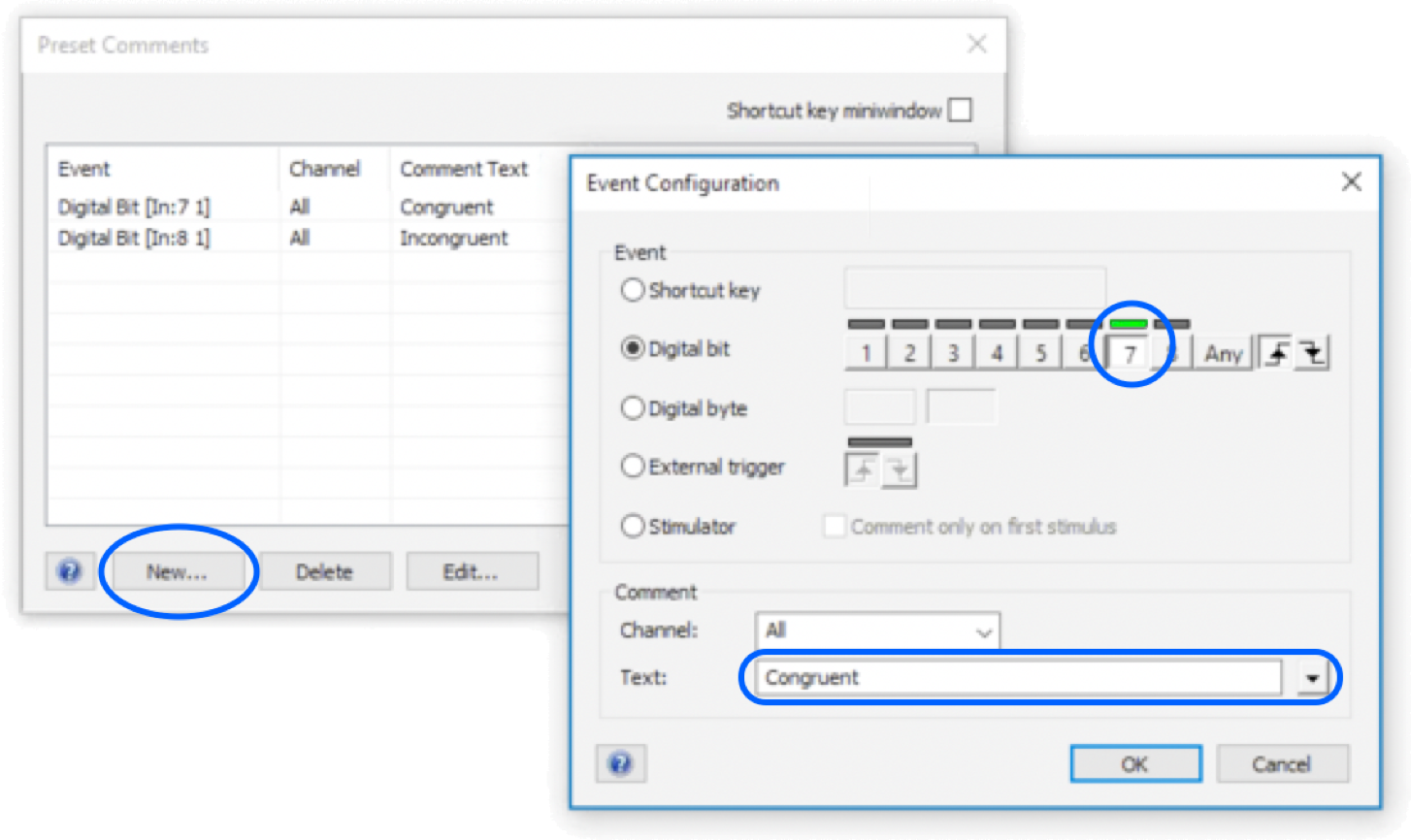 Let’s setup two preset comments to describe a trial’s congruency. We will use digital bits 7 and 8.