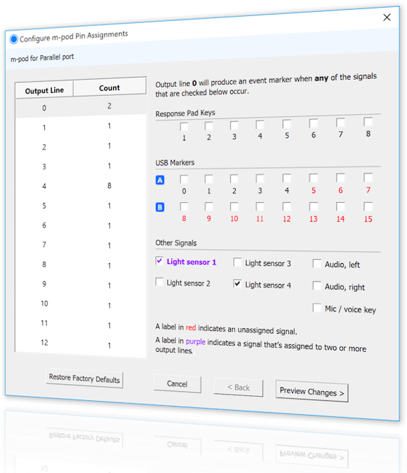 The tables above describe the factory default. If your experiment or lab setup requires different output, Cedrus provides a free utility for configuring your m-pod. After you use it, your configuration is saved to flash memory so that it’s remembered even after you power off m-pod.