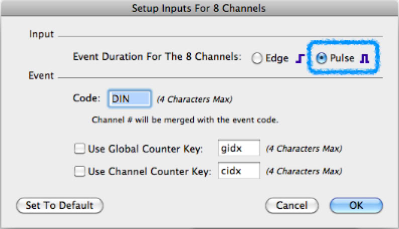In the “Setup Inputs for 8 Channels” window, select the Pulse radio button (highlighted).