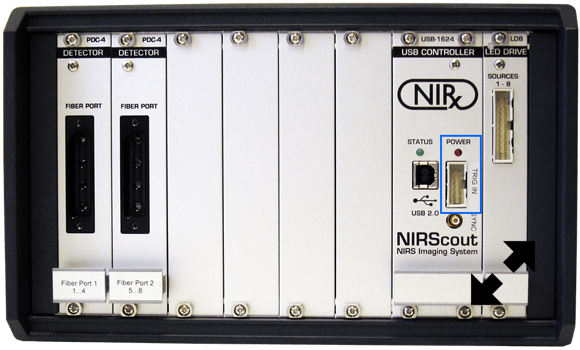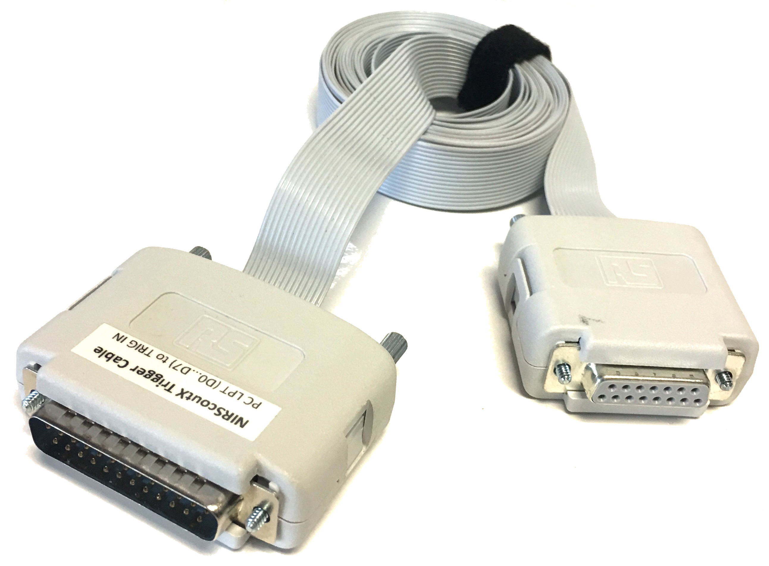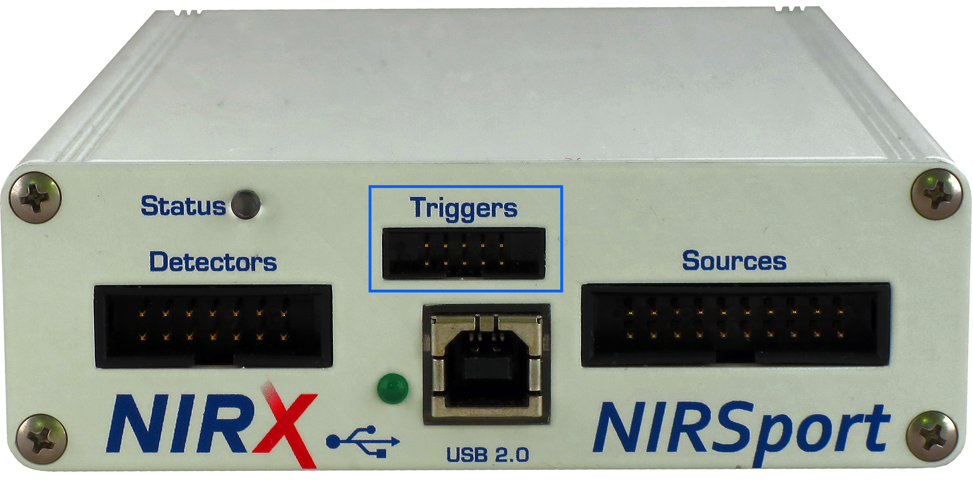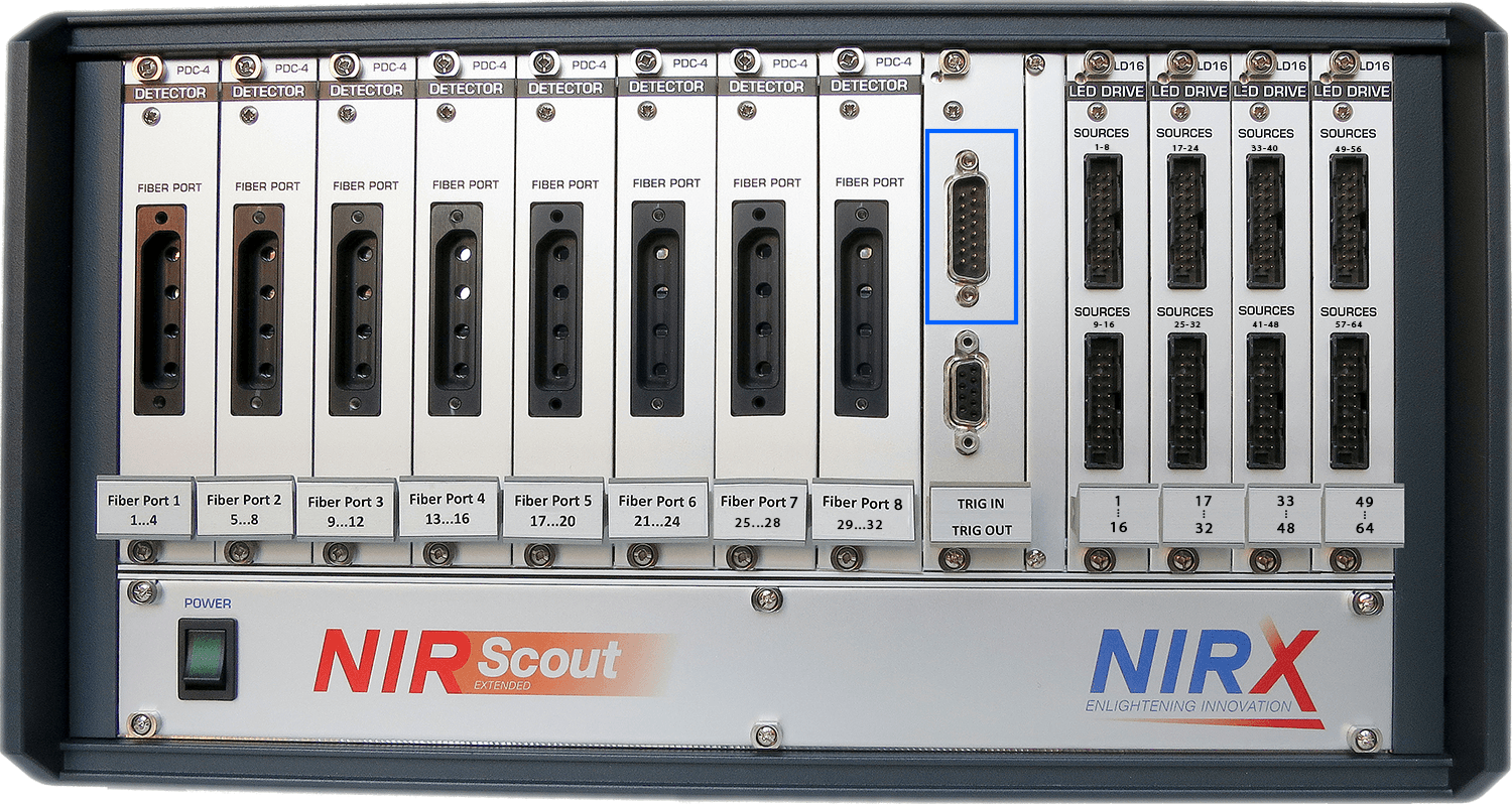 “m-pod for NIRx” delivers 8 bits of external triggers to your NIRx recorder. Depending on the model, 4 or 8 bits will be recorded. m-pod connects to an adapter cable that is included with every NIRx recorder. The other side of this adapter cable plugs into the trigger connector on the NIRx recorder, highlighted in blue in the pictures below. Click on any of them to zoom: