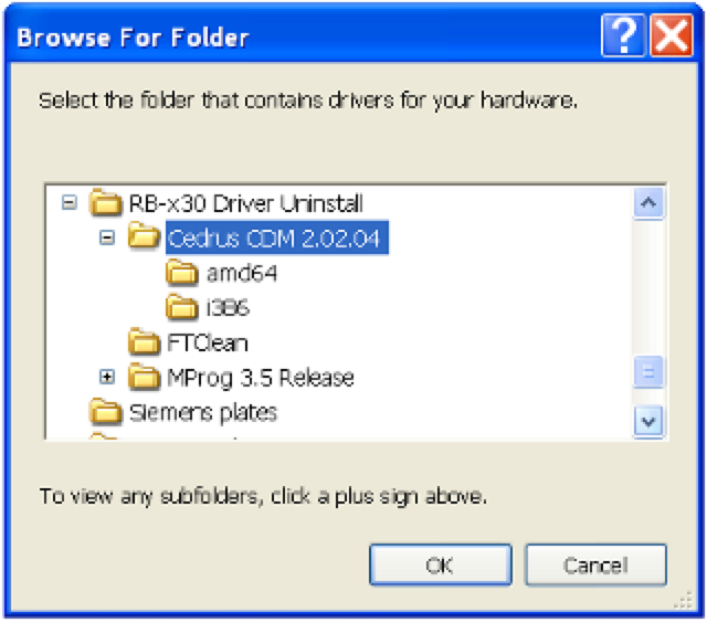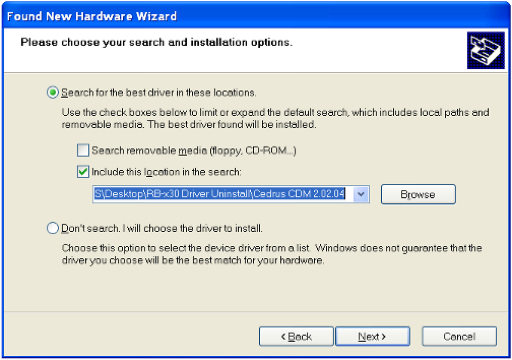 In the next dialog, click on the Browse button. This will prompt you for the location of the USB driver. It can be found inside the “RB-x30 Driver Uninstall” folder that you downloaded and unzipped earlier, in a folder called “Cedrus CDM 2.02.04″: