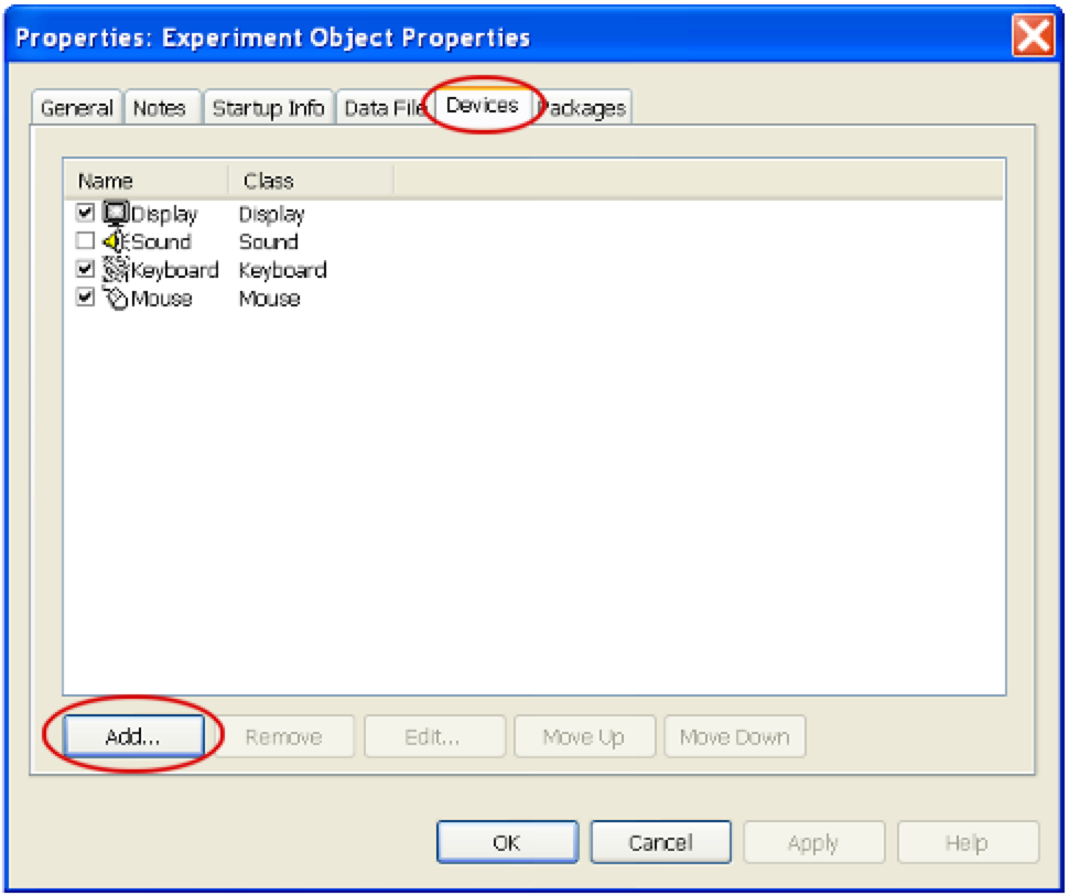 The Experiment Object’s Properties dialog (screen) will appear. Click on the Devices tab, then click on the Add… button.