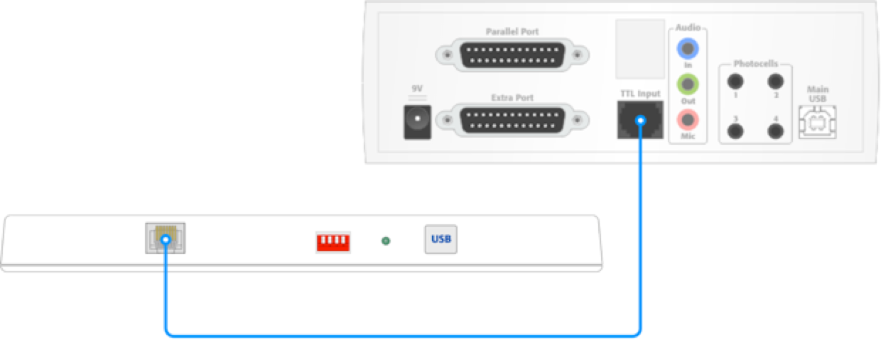 StimTracker can monitor up to six digital (TTL) input lines and generate event markers based on changes in these input lines. For convenience, the TTL Input connector was designed so that a simple and commonly available RJ45/Ethernet cable can be used between the Accessory Connector on Cedrus’ RB Series response pads and StimTracker: