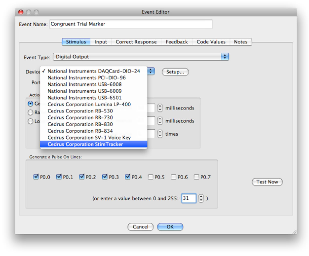 But there are times when sending event markers from the stimulus presentation computer is still necessary, for example to send different event markers to code an experimental condition. When using SuperLab, you can send event markers by creating an event of type “Digital Output” and selecting StimTracker as the output device. In SuperLab 5 and later, StimTracker is the default output device. The following snapshot is for SuperLab 4.5: