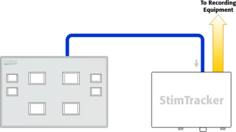 The pins of the TTL Input in StimTracker were assigned in such a way to make it very easy to capture participants’ input in an experiment and forward that information to the EEG recording equipment directly, instead of through the stimulus presentation computer’s USB port. All you need is an Ethernet cable, shown as the blue line in the following diagram: