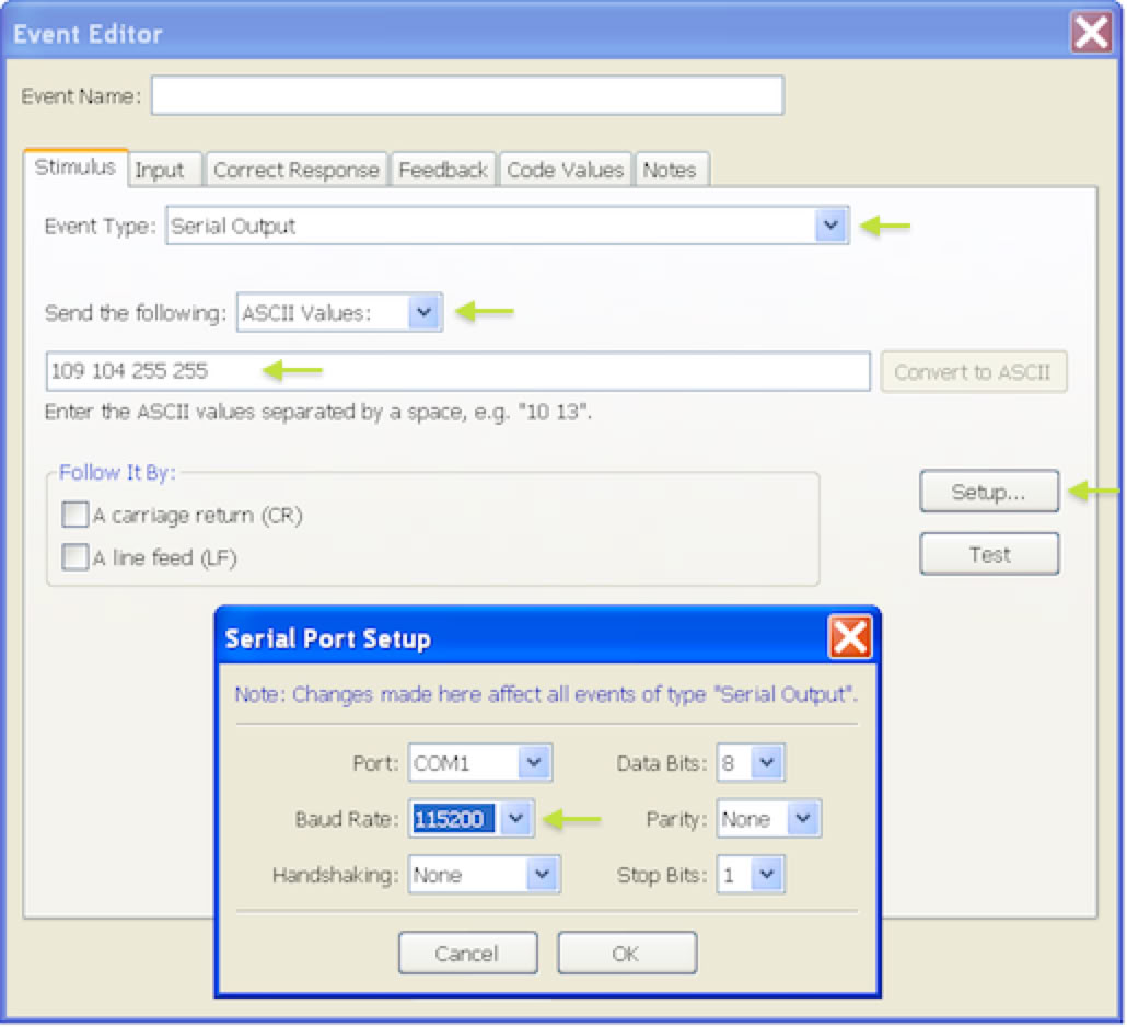 In the Event Editor’s Stimulus tab, click on the “Event Type:” drop down menu and change the event type to “Serial Output”.
