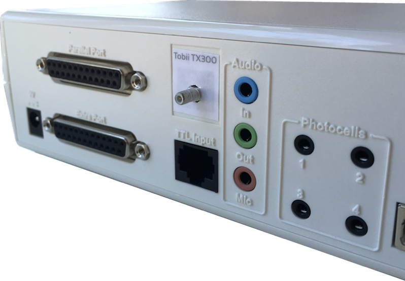 Cedrus manufactures a version of StimTracker that provides a second TTL output for Tobii TX300 eye trackers, with a matching SMB connector (earlier units used a BNC connector, see below). There are no delays between the output to the TX300 and the output to EEG.