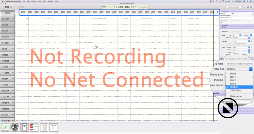 Setting up Net Station 5 is straightforward. Make sure that the setting “DINs 1-8” on the right side is set to “8 DINs”. In the screenshot below, in the upper part of the window, you can see event marker offsets (DINs) being received periodically.