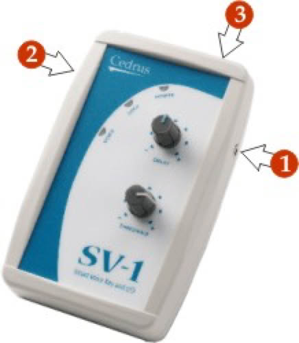 SV-1 ships with a microphone mounted on a headset. This headset has two plugs; one of them has a single wire coming out of it and the other has two wires. The microphone plug is the one with only one wire. Insert it into the round jack on the right hand side of SV-1 (marked with a “1” in the picture).