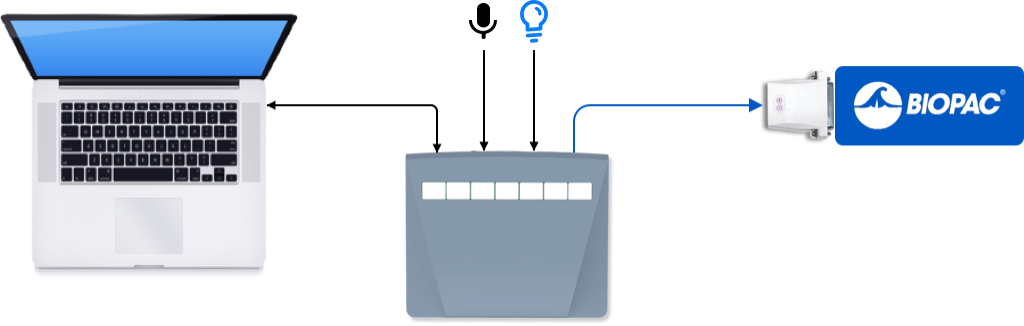The response pad draws its power from your computer via USB. When a key is pressed, information is sent at the same time via USB to the computer and via m-pod to Biopac.