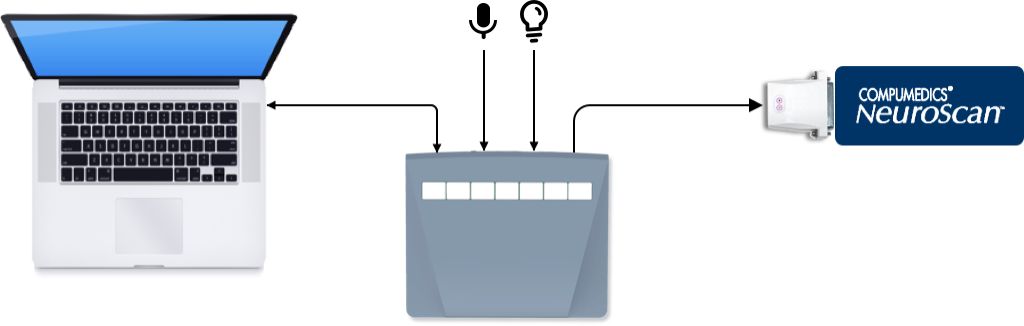 The response pad draws its power from your computer via USB. When a key is pressed, information is sent at the same time via USB to the computer and via m-pod to Neuroscan.