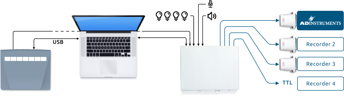 A Riponda response pad and m-pod combo lets you mark onset of participant responses, onset of visual stimuli using a light sensor, onset of vocal response, and send event markers via USB.