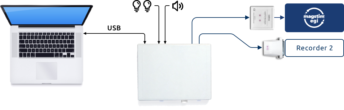 You can go farther by adding a response pad. Keypress information is sent simultaneously via USB to the stimulus presentation computer running SuperLab (or E-Prime, Presentation, PsychoPy, etc.) and to StimTracker.