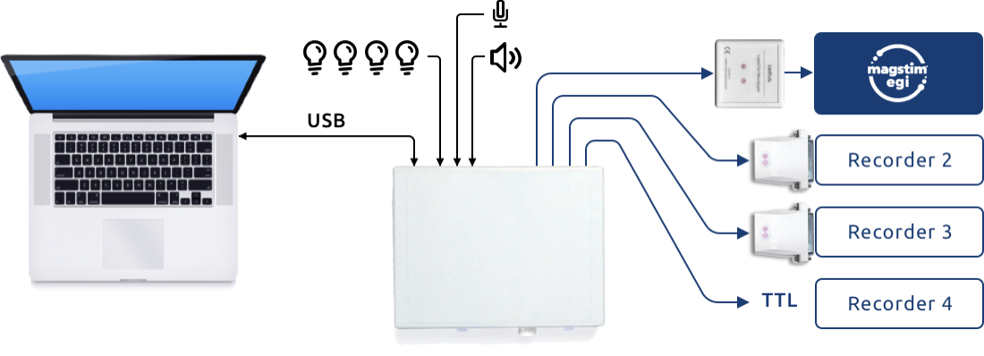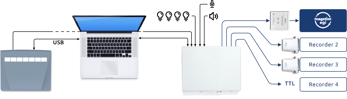 A Riponda response pad and m-pod combo lets you mark onset of participant responses, onset of visual stimuli using a light sensor, onset of vocal response, and send event markers via USB.