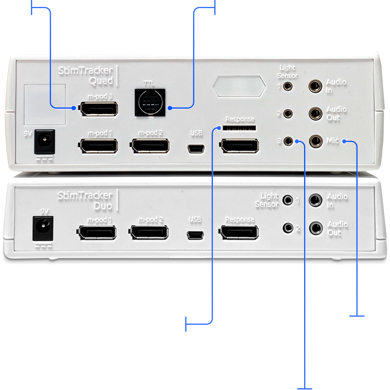 Both StimTracker models were designed for multimodal research from the ground up. The Duo supports two simultaneous outputs, whereas the Quad supports four outputs. The Quad has other features as well; see below.
