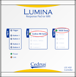 Inquisit version 1.32 or later adds support for the RB-420 and RB-620 response pads. The Lumina LP-400 can be used with Inquisit by setting its mode to “Cedrus RB Series”.