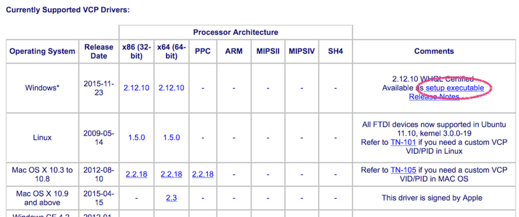 The “setup executable” link is more convenient than the drivers listed in the “x86” and “x64” columns because, when the program runs, it automatically places the USB driver files in the correct location.