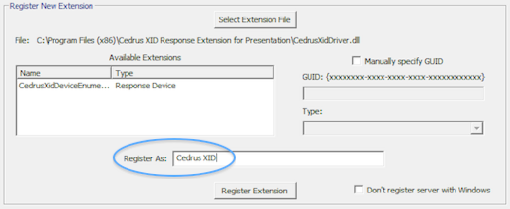 Back in the Extension Manager dialog, look for the edit field labeled “Register As:” and type ‘Cedrus XID’: