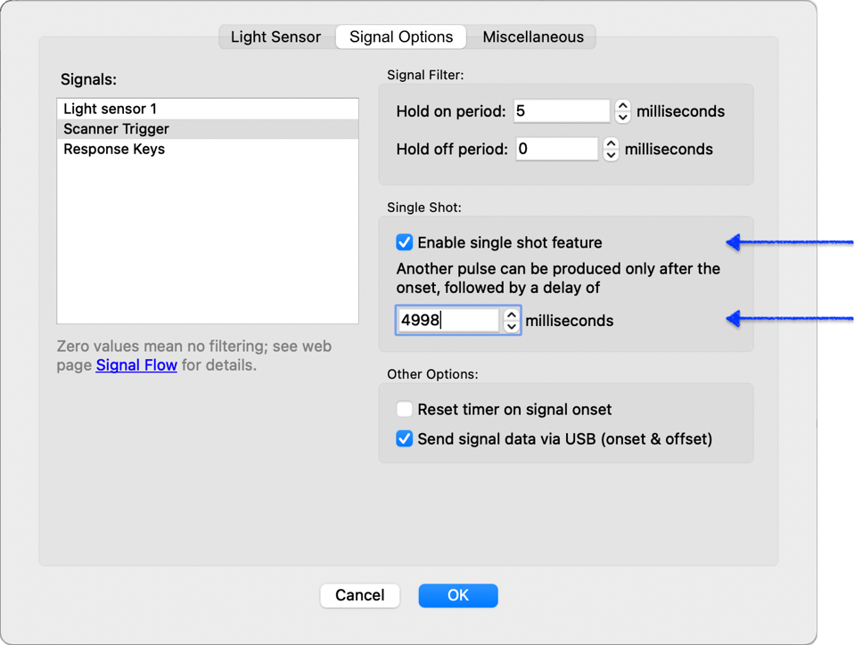 The single shot settings above affect the USB output and m-pod output, but not the Scanner Trigger LED on the Lumina controller. This is by design, for a couple of reasons. The LED is meant to help the user verify that the physical connection between the controller and the MRI scanner is established, and for this reason, its behavior is not affected by any of the signal options.