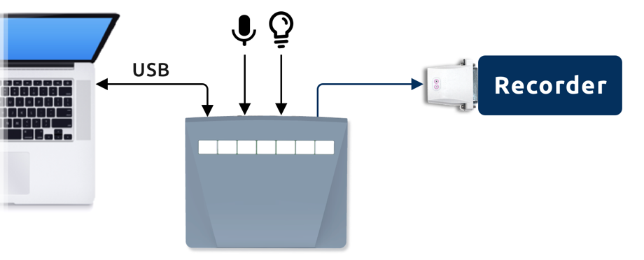 When you press a key on Riponda (or the unit detects a vocal response or onset of a visual stimulus), the information is sent simultaneously via USB to the computer and via m-pod to your biometric recorder.