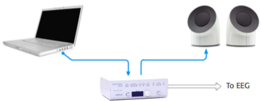 While the onset of an auditory stimulus can be marked by having the stimulus presentation computer send event markers via USB, timing will be more accurate and setup would be simpler if one took advantage of StimTracker’s built-in audio marking capability. Instead of connecting the computer to external speakers like this: