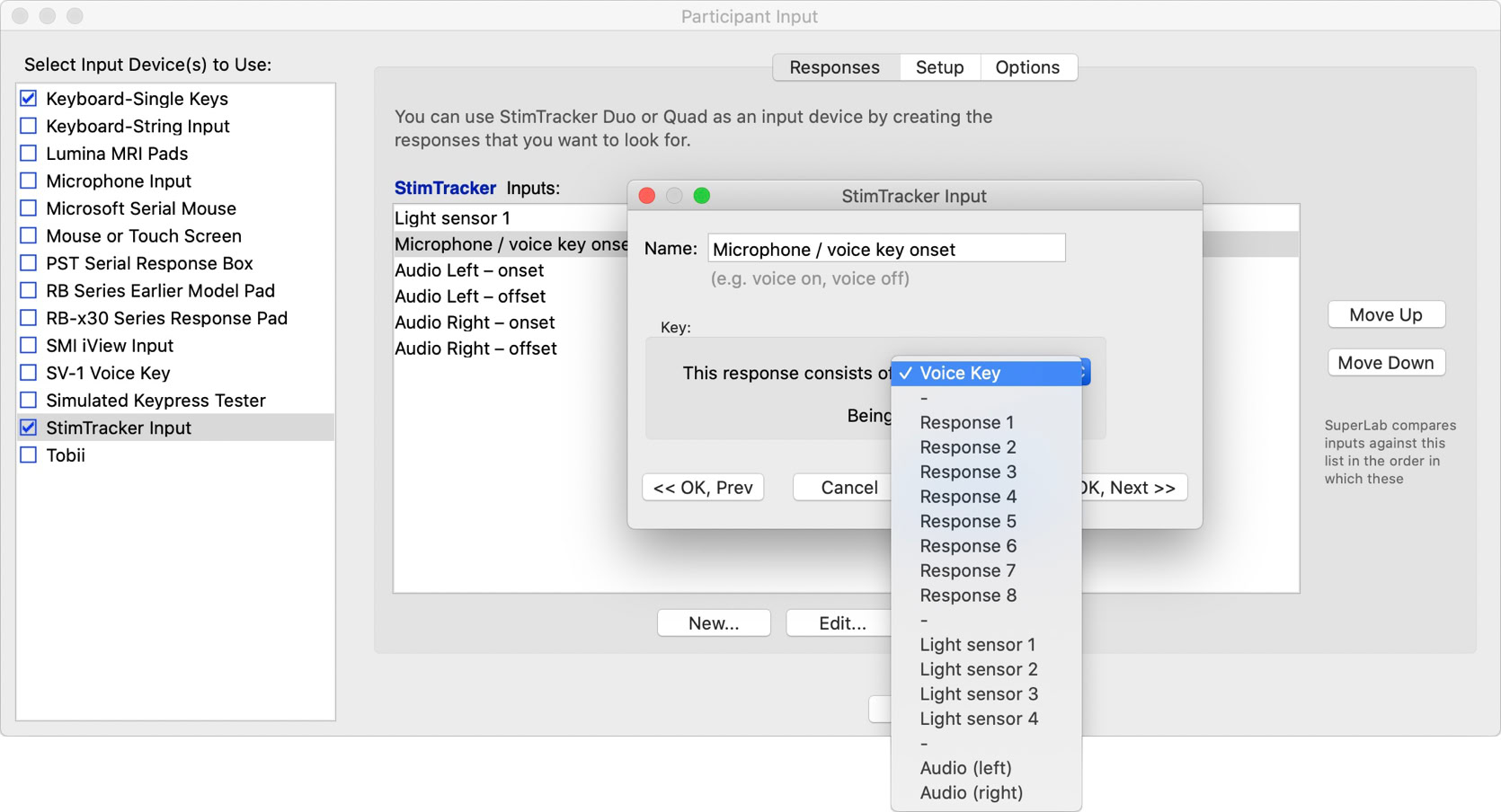 From the Experiment menu, choose Participant Input. In the dialog that appears, select “StimTracker Input”. SuperLab will automatically enable and disable USB output as needed.