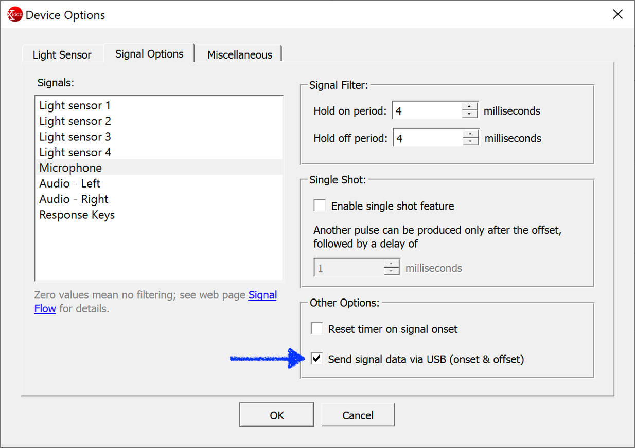 On the left side, select the signal that you want, e.g. Microphone, and then enable the option Send signal data via USB (onset & offset).